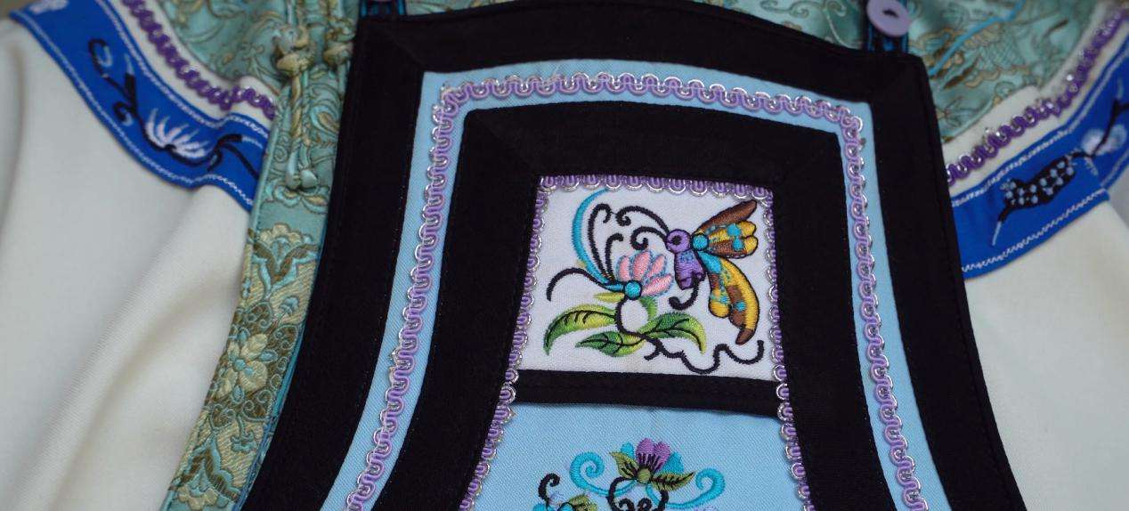 紅星村村內(nèi)布依族村民保留有布依族傳統(tǒng)服飾,在日常生活中也還有穿著布依族服飾的習慣。紅星村布依族女性服飾做工精細,款式多樣。老人頭戴黑色圓帽,上身主要穿著灰白色斜襟上衣和青藍色打底的圍腰,上衣領口至兩肩處繡有大面積花紋圖案,圍腰上部也繡有花紋圖案作為裝飾。圍腰上的兩條絲帶系于身后,絲帶上繡有花紋圖案。下身穿著灰色長褲。