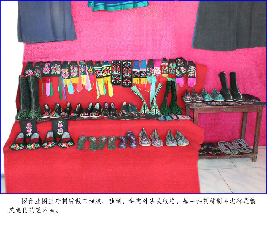 圖什業(yè)圖王府服飾包括:服裝、服飾、鞋帽及馬匹裝飾等。或質(zhì)樸、清新,或漂亮、華貴,或錯(cuò)落有致;既有山水,又有花鳥,形象逼真,惟妙惟肖,色彩協(xié)調(diào),圖案精美;其做工細(xì)膩獨(dú)到,講究針?lè)凹y路,每一件服飾制品堪稱是精美別致的藝術(shù)品。
