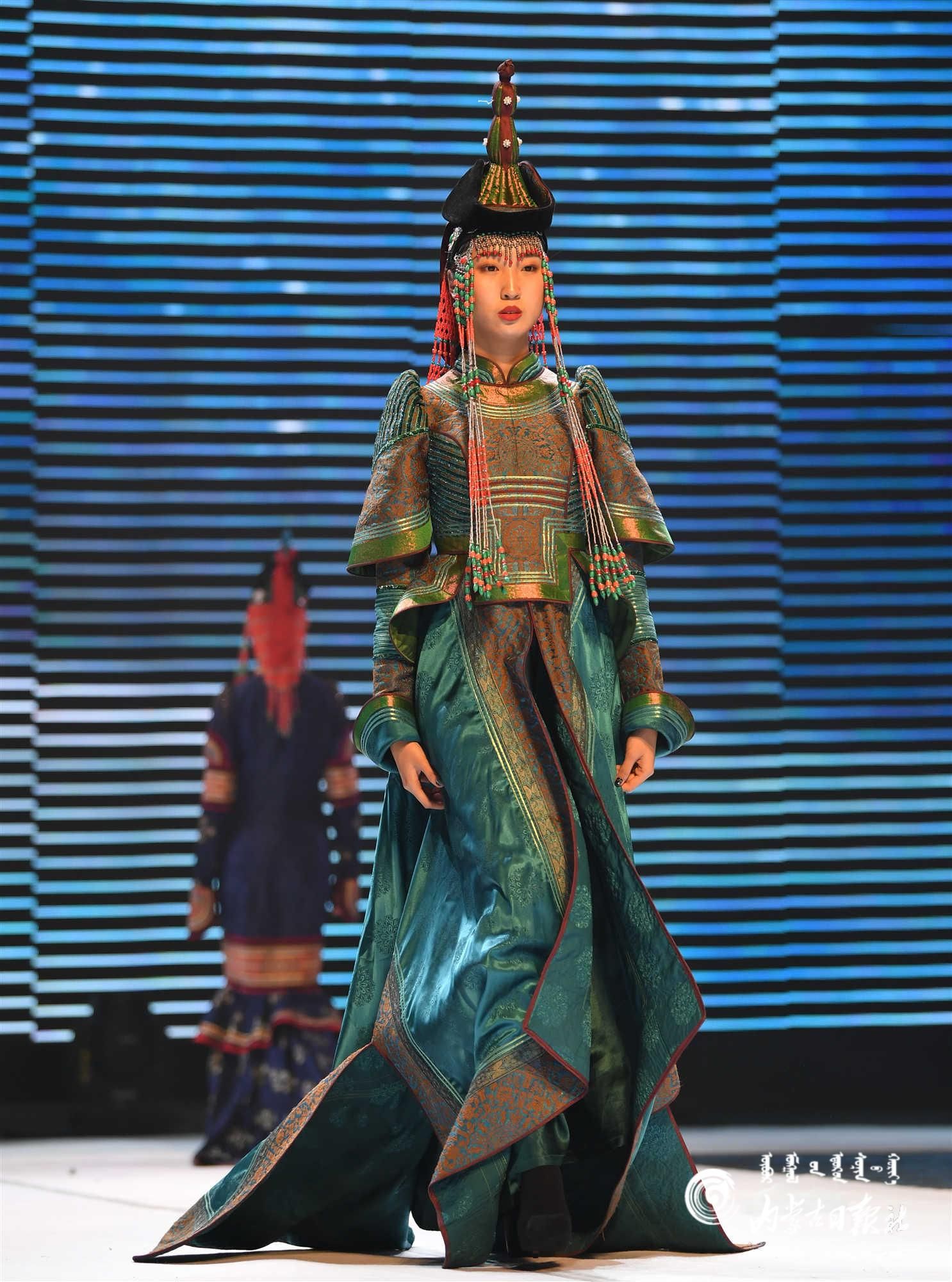 內(nèi)蒙古藝術(shù)學(xué)院的學(xué)生在舞臺上展示蒙古族禮服。