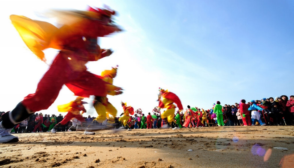 秧歌是春節(jié)群眾歡慶活動(dòng)中,起著承前啟后、烘托氣氛的大型歌舞形式。這里所指的“秧歌”不僅是單一的“秧歌舞”,而是包含著數(shù)十種歌舞形式所組合的文藝演出隊(duì)伍。這支隊(duì)伍既要在走街串巷中做行進(jìn)表演,又將最后集中于廣場(chǎng)做正式的歌舞演出。因此在北方,人們索性就把過去有著祭祀色彩,而今完全成為春節(jié)娛樂式的民間文藝形式稱為“社火”或“秧歌”,把這支浩蕩的隊(duì)伍統(tǒng)稱為“秧歌隊(duì)”。秧歌隊(duì)最前方,在高舉象征來年風(fēng)調(diào)雨順大傘的藝人率領(lǐng)下,“龍舞”“獅舞”舞隊(duì)位列隊(duì)首;接下來是一組手揮彩綢翩翩起舞,走“雙葫蘆”“繞菠花”各種圖案的“大場(chǎng)”表演隊(duì);然后是腰間橫挎紅色腰鼓、踏著激越鼓聲的“腰鼓隊(duì)”,表演著令人眼花繚亂的“回頭望月”等套路;再后面是腰系竹馬或旱船,扮演新郎送媳婦回娘家的“跑驢”或“跑旱船”;接著是腳踩丈八高蹺、穿戲裝、彩繪臉譜的“高蹺隊(duì)”。接下來還有名為《火盆架子》的隊(duì)伍,那是把冬季用于取暖的炭盆架,用繩子將其高于腳面懸掛在肩上。盆架以綢布、花草裝飾,表演者戲裝打扮,表演一段段膾炙人口的戲曲節(jié)目。他們被歡天喜地、熙熙攘攘的人們擁簇著一同前往最后進(jìn)行表演的廣場(chǎng)。由各個(gè)村鎮(zhèn)陸續(xù)舉行的這種熱烈而歡騰的歌舞慶祝形式,將貫穿在整個(gè)春節(jié)期間,直到正月十五“燈節(jié)”。