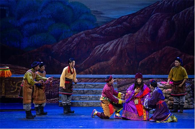 南木特藏戲已有400年的歷史,面對這樣一個彌足珍貴的“中國戲曲活化石”,主創(chuàng)人員對創(chuàng)作主題和表現(xiàn)形式斟酌再三,最后選定以“生命的奉獻”為創(chuàng)作起點,將《唐東杰布》以“老戲新唱”的形式呈現(xiàn)給觀眾。