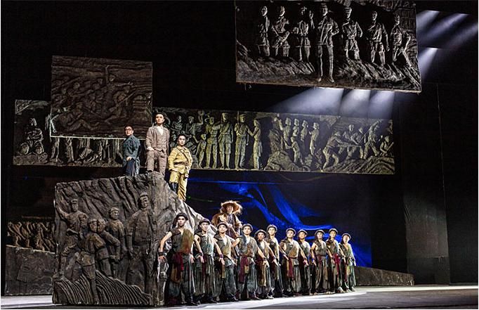 在舞蹈語言的設計上,編導融入當代元素,使觀眾不但感受到審美的親切與現(xiàn)代感,而且還自然地進入回望歷史的情境,對其思想內(nèi)涵的理解更為準確。該劇的道具使用和調(diào)度也頗為大氣,令人印象深刻。一組斜坡狀的大型舞臺道具不但由群眾演員直接移動而實現(xiàn)即時的場景調(diào)度,還可使演員上下和左右而行,最終組合成巨大的中國共產(chǎn)黨黨徽,輔助完成了人民英靈和英雄的形象塑造。