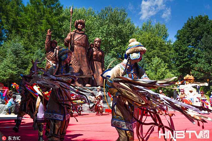 黑龍江省級非物質(zhì)文化遺產(chǎn)項目赫哲族“薩滿舞”“伊瑪堪”代表性傳承人葛玉霞在表演赫哲族的原始舞蹈“薩滿舞”(搜狐網(wǎng))