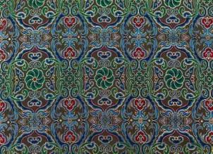 "凡錦樣必有寓意"是蜀錦的藝術特點,往往代表著對生活的愿景和祝福??椩旃に嚰毮亣乐?,配色典雅富麗,大多以經線彩色起彩,彩條添花,經緯起花,先彩條后錦群,方形、條形、幾何骨架添花,對稱紋樣、四方連續(xù),色調鮮艷,對比強烈,別具一格。