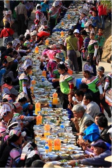 節(jié)日期間,哈尼寨子擺起長街宴,哈尼語叫“姿八多”,意為“互相輪流著敬酒”。小寨子擺一次,吃一天,大寨子則要擺兩三次,吃兩三天。每戶做一桌酒菜,抬到寨子街道上擺好,一戶接一戶沿著街道擺成長街宴,八個(gè)或十個(gè)人自愿結(jié)合為一桌暢飲。大寨子分片輪流做東,負(fù)責(zé)長街宴的酒菜,其他片的人做食客,從早吃到晚,場(chǎng)面十分熱鬧。