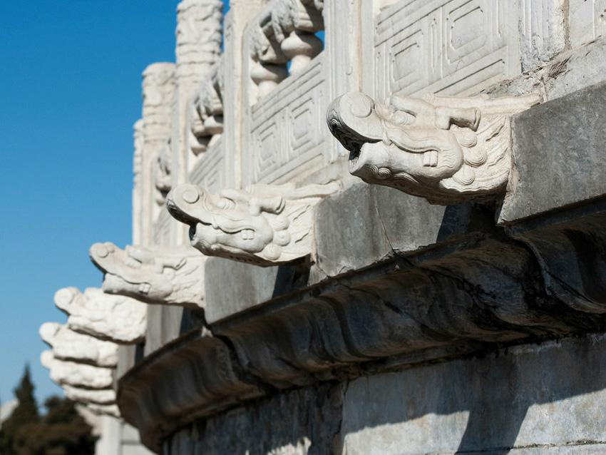 北京天壇祈年殿有三層月臺(tái),第一層月臺(tái)上的排水構(gòu)件是云頭,第二層的是鳳頭,第三層則是龍頭,這個(gè)龍頭就是螭首(chī shǒu)。同樣,故宮太和殿龍鳳云紋的望柱下就有排水螭首1142只,可以想見當(dāng)大雨滂沱之時(shí),螭首千龍吐水是何等壯觀的場(chǎng)面。