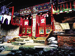在大門至內(nèi)廳的上面用木板鋪成樓層,臥室在二樓,也放糧食和雜物。屋內(nèi)左右山墻即是戶與戶間的隔墻,在墻中分別開有特殊的小門,鄰居互通,稱“隔門”。隔門平時關(guān)閉,遇特殊情況時,村中各戶都打開隔門,變成室內(nèi)通道,自由來往,整個村寨就是一座城堡。