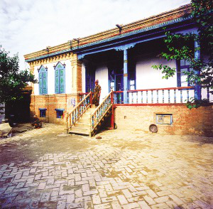 維吾爾族的傳統(tǒng)民居以土坯建筑為主,多為帶有地下室的單層或雙層拱式平頂,農(nóng)家還用土胚塊砌成晾制葡萄干的鏤空花墻的晾房。住宅一般分前后院,后院是飼養(yǎng)牲畜和積肥的場(chǎng)地,前院為生活起居的主要空間,院中引進(jìn)渠水,栽植葡萄和杏等果木,院內(nèi)有用土塊砌成的拱式小梯通至屋頂,梯下可存物,空間很緊湊。