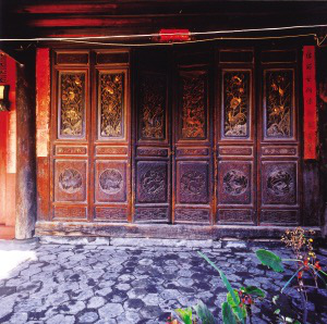 云南大理市綠桃村“三坊一照壁”民居堂屋六扇木門的雕刻。院內(nèi)廈廊和正房的格子門,一般由6扇組成,每扇門又分隔成5塊木板,每塊木板都是透雕和浮雕相結(jié)合的木雕。分別雕刻著“雙鳳朝陽、二龍搶寶、八仙過海、喜鵲登梅、漁樵耕讀、六合同春”的吉祥圖案,刀法嫻熟,輪廓清晰,形象生動,一個院落就是一個木雕藝術(shù)畫廊。此外,窗上有通透的花格,下部檻墻做成木質(zhì)裙板。