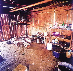 房?jī)?nèi)一般隔成里外兩間,里間狹小,光線暗,是主人的臥室,只放雙人床和一小部分生活用品。外間寬大,是生火煮飯、聚會(huì)待客和子女就寢的地方?;鹛猎O(shè)在里間屋的門外,放鐵制三腳架,三腳架對(duì)應(yīng)的方位有固定的用途,即靠里間房門一方為主人的座位,靠外間房門一方為客人的座位,火塘上方靠墻處為子女的床位。如有成年子女和新婚夫婦,則在外間再隔出小間,里間和外間存放著生產(chǎn)用具和酒具。房?jī)?nèi)幾乎沒有什么家具和裝飾性的陳設(shè),有的甚至沒有桌椅和床鋪,只在火塘周圍鋪著竹席或木板,合衣向火而眠?;鹛辽厦?米多高處懸掛著竹編的約1米見方的架子,上面放著食具、鹽巴、辣椒等,也是烘烤牛肉干的地方。架子上面靠房頂處并排放著幾個(gè)粗大的竹筒,里面存放糧食。這幾年的新村民居,在保持傳統(tǒng)民居特征的前提下使用了新型建材,更堅(jiān)固,更舒適。