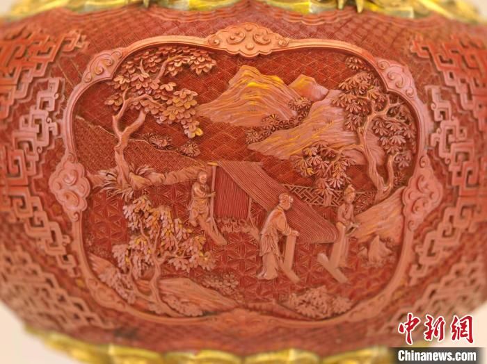 沈陽故宮博物館相關負責人表示,此件漆器工不厭精,裝飾富麗,帶有乾隆朝剔紅漆器精致華美、大氣雍容的時代風格,反映了清代盛世的審美趣味。男耕女織的雕刻圖景反映清朝統(tǒng)治者以農(nóng)桑為治國之本的思想觀念。此次沈陽故宮展出乾隆款剔紅開光山水人物紋龍耳瓶,意在用文物展現(xiàn)中華文明之美,讓人們感受中國傳統(tǒng)藝術珍品的博大精深和意境之美。