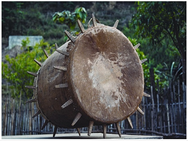 民族文化宮博物館藏基諾族木質(zhì)皮鼓,鼓面直徑55厘米,高88厘米,長約130厘米,20世紀(jì)八十年代征集于云南省西雙版納州景洪縣基諾鄉(xiāng)。鼓身為木質(zhì),呈圓柱形,兩端對稱。鼓有兩面,用牛皮蒙制。兩端鼓面邊緣各環(huán)繞嵌有花紋的上方下錐形的木棍(一側(cè)17根,另一側(cè)為20根),木棍長15厘米。鼓身兩側(cè)有方形孔,為鼓的音孔,上部有兩個(gè)把手,用于系繩懸掛木鼓。因鼓面兩端邊沿嵌有數(shù)十根鼓釘,形似太陽放射出的光芒,也稱為“太陽鼓”。
