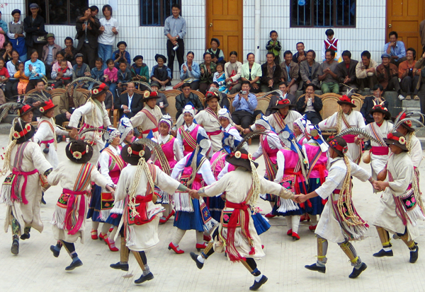 ?。?)反映風(fēng)俗禮儀的舞蹈。主要有婚禮舞?;槎Y舞主要流行于云南怒江、保山、德宏等地區(qū)傈僳族中,是在舉行訂婚、結(jié)婚的喜日儀式跳的一種群體舞。跳時(shí)男女分開,面對面排列成兩排,以一定的步伐和有力的跺腳、踏步為拍,有時(shí)并列前進(jìn),或交叉進(jìn)行,有時(shí)一進(jìn)一退,互相呼應(yīng)。其舞步重在腳下功夫,動作簡單、重復(fù),但一旦起舞,情動于中,熱烈非凡。