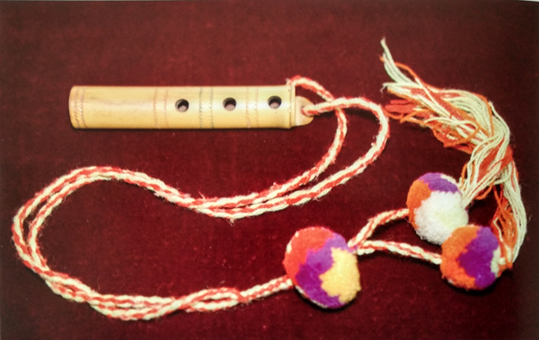 直笛,傈僳語稱之為“迪哩吐”(如圖),多用蘆葦制作,長約5寸,有4個(gè)圓孔,3孔在正面,1孔在背面,音量較小,音色柔和動聽,為青年男女抒情和求愛必要的工具。