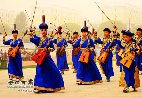 2016年8月底,肅北作為甘肅省唯一以蒙古族民族為主體的自治縣,特意承辦了八省(區(qū))第七屆“母語杯”蒙古文書法大賽作品展。在其頒獎(jiǎng)晚會(huì)上,肅北縣烏蘭牧騎登臺(tái)亮相,博得一次次熱烈的掌聲。演出節(jié)目包括:歌曲《父親的故鄉(xiāng)》《陽光下的母親》《不會(huì)忘記》,舞蹈《筷子舞》《薩吾爾登》,馬頭琴齊奏《風(fēng)中的蘇力德》等。