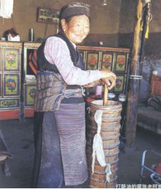 藏族生活在號稱“地球第三極”的青藏高原上,高寒的高原氣候,嚴酷的生存環(huán)境,造就了藏民族勇敢剛毅的民族個性,也形成了藏民族獨具高原特色的飲食文化,藏鄉(xiāng)的酥油茶便是其中一朵奇葩。酥油茶是藏鄉(xiāng)群眾日常生活所必需的一種飲料,也是藏族人民待客、禮儀、祭祀等活動不可或缺的用品,極具民族特色和文化內(nèi)涵。剛進藏的漢族干部,要適應(yīng)高原環(huán)境,首先要過生活關(guān),其中重要的一條就是能不能喝酥油茶。顧名思義,酥油茶由酥油、茶和食鹽三種原料做成。