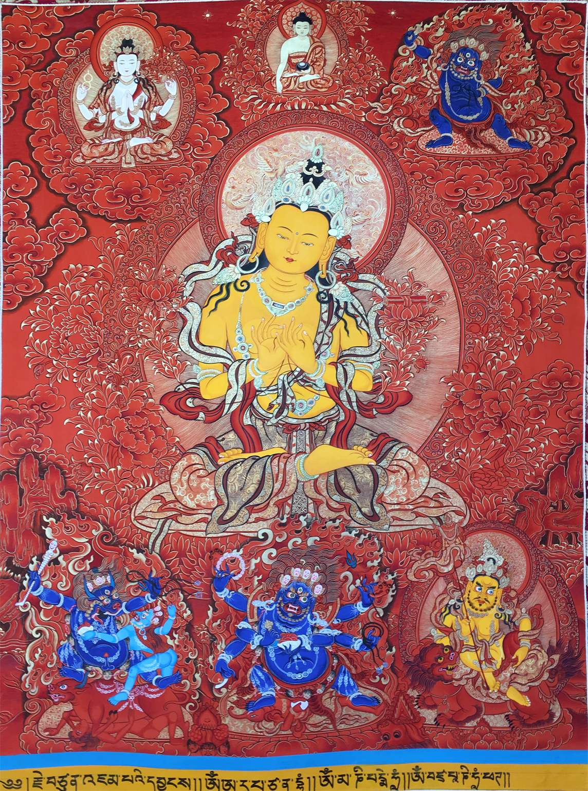 所乘之獅子,象征其威猛。文殊菩薩是如來(lái)佛祖怙恃之一。唐卡的原料是以純金、純銀、珊瑚、綠松石作為主要顏料、也可以是諸石朱砂、鉛粉或黃德粉這些普通顏料、正宗的唐卡可以收藏?cái)?shù)百年而不褪色、具有極強(qiáng)的收藏價(jià)值。
