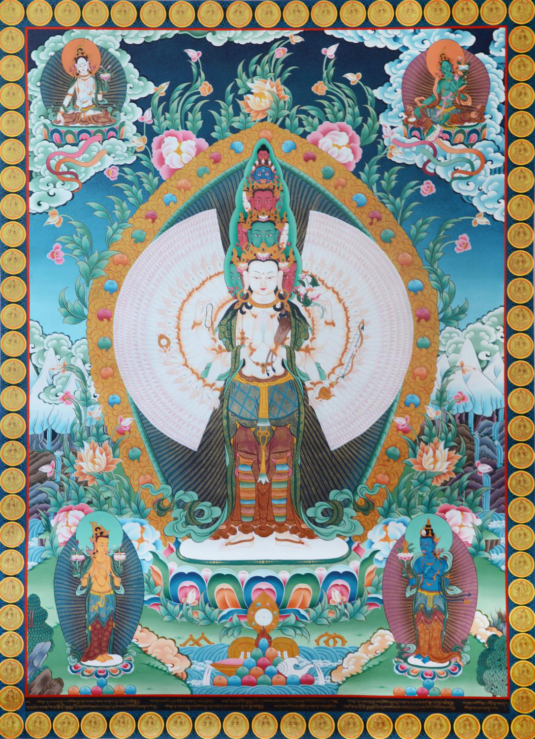 "千手觀音"全稱"千手千眼觀世音菩薩",又稱"千眼千臂觀世音菩薩",是佛教六觀音之一。 佛教認(rèn)為,眾生的苦難和煩惱多種多樣,眾生的需求和愿望不盡相同,因此,就應(yīng)有眾多的無邊法力和智慧去度濟眾生。據(jù)《千手千眼觀世音菩薩廣大圓滿無礙大悲心陀羅尼經(jīng)》說,觀世音菩薩在過去無量劫,聽千光王靜住如來講《廣大圓滿無礙大悲心陀羅尼經(jīng)》時,為利益一切眾生,"即發(fā)誓言,若我當(dāng)來堪能利益安樂一切眾生者,令我即時身千手千眼具足","發(fā)誓愿已,應(yīng)時身千手千眼悉皆具足",變現(xiàn)出如意寶珠、日精摩尼寶珠、葡萄手、甘露手、白佛手、楊柳枝手等。無論眾生是想渴求財富,還是想消災(zāi)免病,千手觀音都能大發(fā)慈悲,解除諸般苦難,廣施百般利樂。在佛教看來,只要虔誠地信奉千手觀音,就有"息災(zāi)","增益","敬愛","降伏"等四大好處。