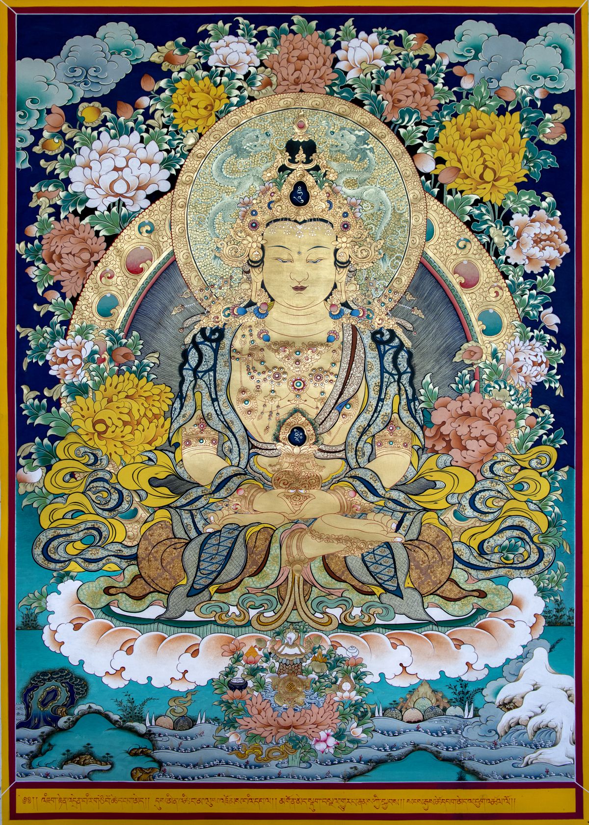長(zhǎng)壽佛(梵名Aparimita āyur jnāna su-vinisˊicita tejo rājāya tathāgata),在漢譯佛經(jīng)中無其形象之記載描述,藏傳佛教中其畫像為一面二臂,肌膚紅色,盤發(fā)成髻戴五佛寶冠,上穿天衣,下著綢裙,身佩珍寶瓔珞,具足一切報(bào)身佛的種種莊嚴(yán),雙手結(jié)禪定印于膝上,托長(zhǎng)壽寶瓶,雙足以金剛雙跏趺安住于蓮花月輪上。