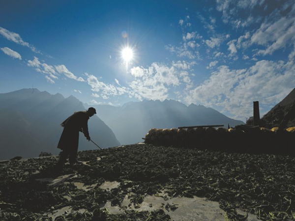 夕陽(yáng)西下,陽(yáng)光從山的后面投射出光束,一只老鷹在山谷上空順著風(fēng)勢(shì)盤旋。楊慶平又開(kāi)始將晾曬的煙葉慢慢收攏?!叭死狭耍沂遣粫?huì)離開(kāi)寨子了,也離不開(kāi)了?!睏顟c平說(shuō)他會(huì)一直守護(hù)著祖屋,守護(hù)著寨子。