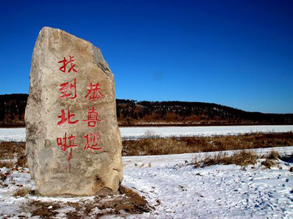 沿著形態(tài)各異的“北”字,可以走到中國最北端的廣場——北望埡口?!皷|經(jīng)122°20'43。48〃E北緯53°29'52。28〃N”的標(biāo)志就立在這里,旁邊一塊巨石上刻著“中國北極點”。