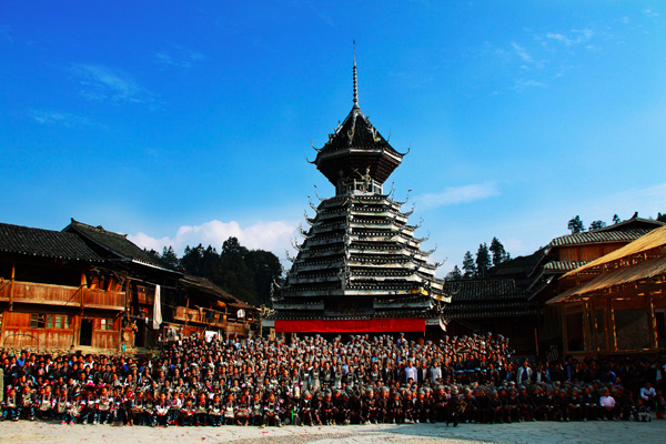每年的農(nóng)歷八月十五中秋節(jié),小黃都會舉行賽歌會,有幾十上百人唱歌的壯觀場面,是觀賞侗歌的最佳時機。侗族的大歌表演常在鼓樓舉行。侗族的鼓樓、風(fēng)雨橋和大歌是侗族原生文化最突出的標(biāo)志,被稱作“侗寨三寶”。鼓樓是侗族村寨的標(biāo)志性建筑,形似巨大的杉樹,村民稱之為“遮蔭樹”。在沒有鼓樓的年代,人們的許多活動是在古杉樹下進行的。后來,為了滿足社會和文化活動的需要,修建固定建筑物時便以杉樹為原型。文獻資料稱:“侗人居溪峒中,春以巨木埋地作樓,高數(shù)丈,歌者夜則緣宿其上?!边@就是最初的“鼓樓”。