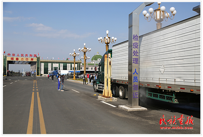 不斷有旅游大巴和貨車從琿春口岸駛過。圖為準(zhǔn)備入境中國(guó)的俄羅斯大貨車做檢疫處理