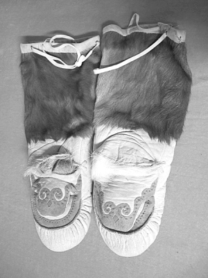 現(xiàn)收藏于民族文化宮博物館的這副狍皮手套,是鄂倫春族冬季狩獵時必備的傳統(tǒng)服飾之一。該手套拇指與四指分開,四指部分連成一體。手套通長48厘米、寬13厘米,套口處穿有一根可收縮的白色帶子。手腕處到套口是外翻毛皮,長21厘米。手心外翻皮毛長近5厘米,拇指和掌邊及四指前部用染色小塊獸皮剪裁成云卷蝴蝶紋進行補繡,紅、綠線縫皮邊,云紋中間有一棱形藍色布裝飾。該手套選料精良、樣式古樸,是狍皮手套的精品,體現(xiàn)了鄂倫春族獨一無二的游獵文化。
