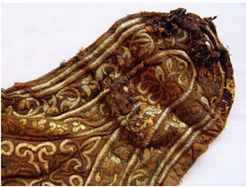 我們曾經(jīng)描述過元代納石失生產(chǎn)的空前絕后。蒙古民族把對于黃金的寶愛,傾泄進(jìn)元朝一百年的歷史時空。在整個13世紀(jì)的每一個歷史篇章,都鐫刻著納石失的金縷光影。我們在史料里看到,天子之衣是納石失,天子之裳是納石失,天子之履依然是納石失。那么,蒙元一代,還有什么是用黃金絲線耗盡心血織繡而成的呢?現(xiàn)在,我們看到了這只金繡弓囊。