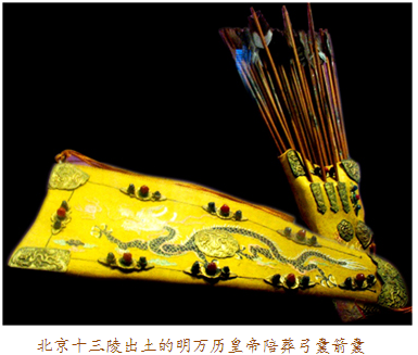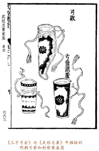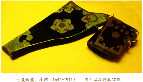當(dāng)弓囊出現(xiàn)在眼前時,我們應(yīng)當(dāng)想到它的另一半——箭囊。實(shí)事上,古代盛裝弓箭的器物被稱為櫜鞬(gāo jiàn),櫜盛箭,鞬裝弓,多以皮革制作。比如明十三陵出土的萬歷皇帝陪葬品櫜鞬,就用皮革縫制,外敷黃色素緞,金繡龍紋,鑲嵌金飾件及各色寶石。一般來說,弓囊為上寬下窄的袋形,箭囊則為長方形。在蒙古語中,弓囊與箭囊合稱為“撒答”。因?yàn)椤按稹迸c“袋”讀音相近,所以元代的漢族作家便在作品中將之寫為“撒袋”。這樣,“撒袋”一詞便入了漢語詞匯,特指裝弓盛箭的袋子。