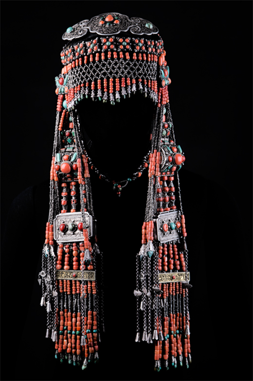 額頂飾:飾在頭箍之上, 形狀近似橢圓形,前部有四塊方形銀片,上掐絲嵌綠松石和珊瑚,其中最前部掐絲鑲紅珊瑚、綠松石拼成的蝴蝶型圖案, 銀掐絲工藝為托座。從整體來(lái)看銀絲捧紅花綠葉, 十分美麗。額頂飾兩端縫于青緞?lì)^箍上, 居于整個(gè)頭飾的中心位置。