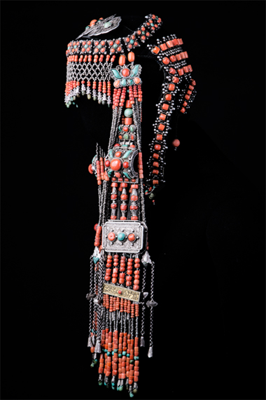 清代烏拉特蒙古族婦女頭飾, 具有著豐富的民俗思想和宗教思想。如頭飾中鑲嵌的珊瑚, 有的雕成日形, 有的雕成月形, 亦有山形、火形等等, 這與蒙古族自古以來(lái)的薩滿教崇拜有關(guān)。又如銀托座做成蓮花形、金鋼杵形或法輪形, 這又受喇嘛教的深刻影響。再如飾物做成魚(yú)形、蝙蝠形、壽字、喜字等等,則是中原漢族常用的吉祥圖案, 是漢文化滲入的反映。復(fù)如飾物上的珠子多為奇數(shù), 有三、九或是三、九的倍數(shù)等, 這是蒙古族長(zhǎng)期形成的民族吉數(shù), 以九為大。整個(gè)頭飾就是一部民族思想觀念的綜匯大成。