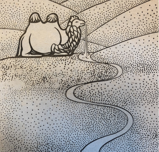 高興之際,大家想起了馱經(jīng)馱水土的駱駝;但是人們四下里一看,白駱駝不見(jiàn)了。真是,為了找水喝竟把勞苦功高的駱駝丟失了!大家找呀,找呀,找了一夜還沒(méi)找到,天亮?xí)r,又回到燒茶的地方,然后順?biāo)?,繼續(xù)尋找。走不多遠(yuǎn),發(fā)現(xiàn)駱駝在前面靜靜地臥著,人們高興極了,有一個(gè)人三步兩步跑上去拉駱駝,可是駱駝一動(dòng)也不動(dòng)。眾人上前詳細(xì)一看,白駱駝已變成了石頭。那石駱駝在水里臥著,一股清水從它的嘴里噴出來(lái),散發(fā)看清香的氣味,流向遠(yuǎn)方。