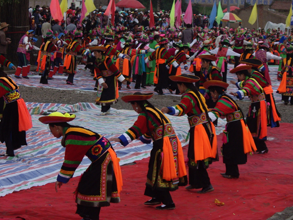 不同地區(qū)的土族舞蹈具有相對(duì)獨(dú)立性,互助的“安昭”、民和的“納頓”、大通的“踏灰”、同仁的“於菟”、甘肅卓尼的“嘎爾”等是最具代表的民間舞蹈。“安昭”,土語稱之為“千佼日”,意為“彎曲”或“轉(zhuǎn)圈”,是土族民間喜慶節(jié)日和婚禮儀式中,用于禮贊祈祝的一種圓場(chǎng)群舞,也是一種歌舞結(jié)合、無樂器伴奏的集體舞蹈。一般由男女各半圍成圓圈,由一男子帶領(lǐng),一唱眾和。舞蹈動(dòng)作簡單質(zhì)樸,舞者兩手由右胯旁起向左上方至右上方劃圓弧,變?yōu)樽笫智谀X前,右手高居于后,似雄鷹翱翔于藍(lán)天?!办遁恕蔽杓椿⑽琛!办遁恕?,是古代楚人對(duì)虎的方言稱謂。每年農(nóng)歷十一月二十日祭山神時(shí),名為於菟的舞者在赤裸的上身繪制虎豹圖案,模仿虎的形象“前端腿跳”舞蹈,達(dá)到祀神驅(qū)邪、祈求平安的目的。