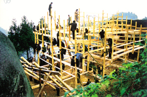 花瑤同胞修建新屋,至今沿襲著奇特古老的巫風。對于宅基地的選擇要請地仙擇地,幫助選向和挑選動工日期。待三柱或五柱一扇的木架子做好后,豎架上梁的那天,全寨的親鄰都會主動來幫忙。用繩子拉的、用叉子撐的、用肩膀頂的、用木槌敲的、用雙手推的,各居各位后,一聲喊起,—扇木架瞬間立于宅基上了。