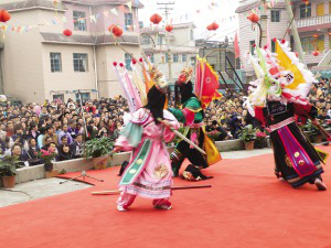 在貴陽花溪,地戲可不止大寨一撥?;ㄏ獏^(qū)的地戲共有18撥,也就是各個村寨的地戲隊:花溪大寨、燕樓的思惹、槐州、燕樓村(燕樓村有兩撥)、谷蒙、黨武的當陽、葵林村、新寨、下壩、湖潮的新民、楊梅、寅貢、車田、蘆官、汪官、元方和麥坪的杉木二村。這些地戲隊所演出的劇目都是《薛仁貴征東》、《楊家將》、《羅通掃白》、《三國演義》、《岳飛傳》等歷史故事劇,表演場地方便人們觀看。演者均戴面具,服飾簡單,以鼓擊節(jié)而歌,一人領(lǐng)唱,眾人合之,不用其它樂器伴奏,其風(fēng)貌近似陽腔。