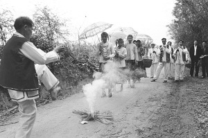 迎親隊伍出村口時要“過火堆”,求吉利