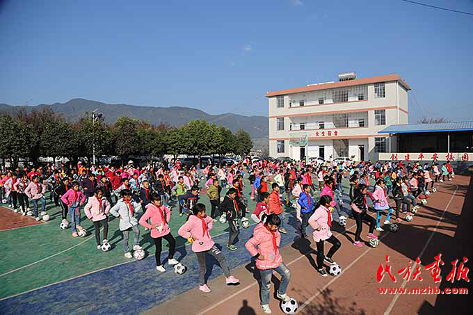 在新村聯(lián)排別墅的最南邊是中村鄉(xiāng)小學(xué),這所學(xué)校是同傈園新村相依而伴建在一起的。上午十點(diǎn),課間操的鈴聲打破了新村的寧靜。學(xué)生們歡快地沖出教室,每人手捧足球,來到操場。在老師統(tǒng)一的號令下,孩子們跳起了足球課間操。歡快的音樂旋律,伴著運(yùn)球、帶球等不同的動作,孩子們的天真爛漫得到了充分詮釋。小學(xué)校長張世喜看著學(xué)生們歡樂的表情,高興的表情溢于言表。他說:“孩子們太幸福了。”16年前,張世喜從楚雄師院畢業(yè)回到了家鄉(xiāng)的中村鄉(xiāng)峨山村委會小學(xué),“場是土巴地,籃球架是用兩棵大樹做成的,教室里的桌椅高矮不一,找不到品相相同的兩張課桌,孩子們的宿舍是兩三個人擠一張床……”回憶起那時情景,張世喜記憶猶新。 “現(xiàn)在好了,住宿生縣財(cái)政每月每人都要補(bǔ)貼100元伙食費(fèi),孩子們頓頓有肉吃了,還為我們建起了兩棟宿舍樓,268名住宿生每人一張床,再也不用擠著睡了?!睆埵老舱f,在這樣的辦學(xué)條件下,我們工作越來越有激情了。