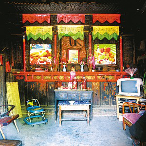 隴川縣戶撒鄉(xiāng)曼旦寨是阿昌族古老的村寨之一,明、清時期的老宅皆以楠木建造,數(shù)百年不朽、無蟲蛀。受漢族文化影響,傳統(tǒng)民居大都是土木石結(jié)構(gòu)的三合一照壁或四合院落。正房建在長方石條加土方壘起的屋基上,屋基下為院壩,以三層石階上下。正房三開間,四排五柱,中柱起脊,形成雙斜面屋頂,上覆凹型青瓦。后墻和兩側(cè)山墻以土坯砌筑,外面不抹泥,左右是廂房或照壁。室內(nèi)隔墻均為木板,中間一間為堂屋,有一米多寬的吞口,六扇雕刻的木板門,平時只開中間兩扇。兩邊的檐柱頭有粗獷的木雕。吞口有走廊的作用,一般左側(cè)角設(shè)臉盆架以供洗漱,板壁上掛小鏡框以便梳妝,旁邊掛著家人的照片。有的擺著縫紉機,有的放藤椅小憩。右側(cè)放臨時的農(nóng)具,掛衣服,板壁上貼著影視明星的招貼畫。堂屋正面板壁是通高的木雕佛龕,供奉佛像和傣文的經(jīng)文,龕楣上貼著三至四層掛錢,下面有燭臺、香爐。左側(cè)擺著電視機、熱水瓶、茶桌,板壁上掛著戶撒刀和手工編織的背兜,右側(cè)有專供老人休息的床或藤椅,也有的砌火塘,火塘的小土臺上放著炒菜的調(diào)料、火柴和照明燈具。