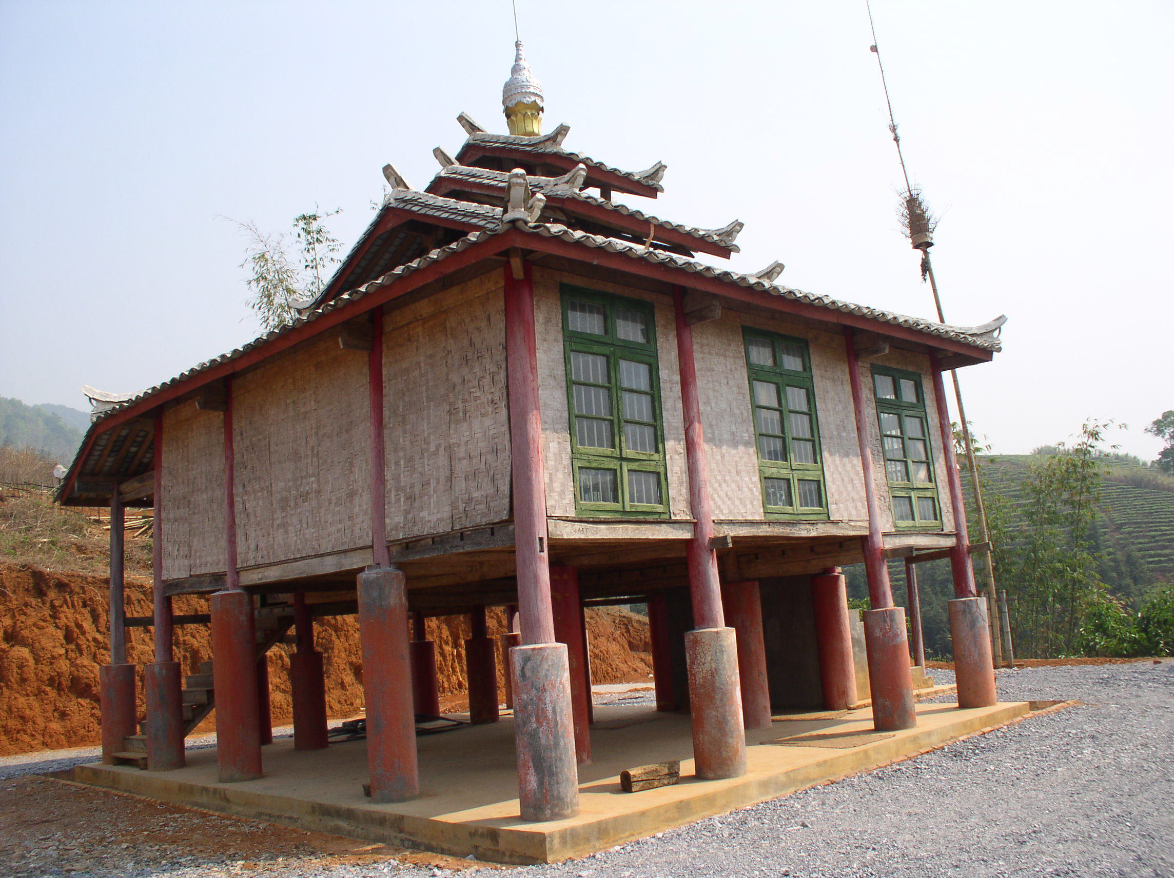 德昂族的家庭民居多為竹木結構、歇山式草頂?shù)母蓹诮ㄖ矫嬗虚L方形、半圓形、弧形等多種風格。干欄式民居分上下兩層,上層住人、下層作畜廄,有主副兩座樓梯。歇山式草頂為圓弧形的民居,當?shù)胤Q“氈帽形”,風格粗獷。民居構架為穿斗式木梁柱,樓面、隔間均用竹片或木板鋪設。在德宏等地是一家一院,主房樓上住人、煮食、貯藏糧食,樓下關牲口;附房用作堆放柴草和安裝舂米用的腳碓。鎮(zhèn)康地區(qū)若干小家庭同住一幢房子,房內(nèi)中間有寬敞的走道,兩旁為各小家庭住室,間壁而居,各有火塘,所以竹樓較大,有的占地近400平方米。20世紀50年代以后,這種竹樓建筑已有改變,現(xiàn)在部分德昂族的住宅與附近漢族的平房一樣。德昂族信仰佛教,有些村莊里建有寺廟,每逢佛事活動人們就來到寺廟里,舉行隆重的儀式。