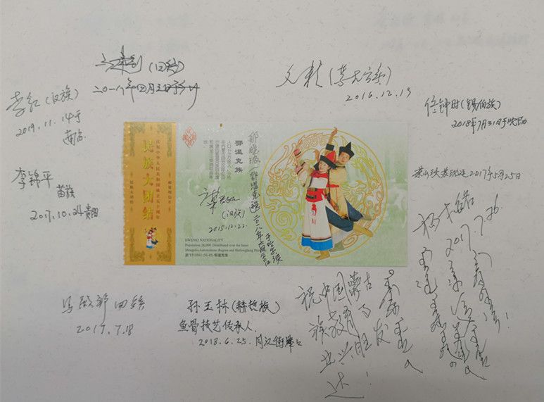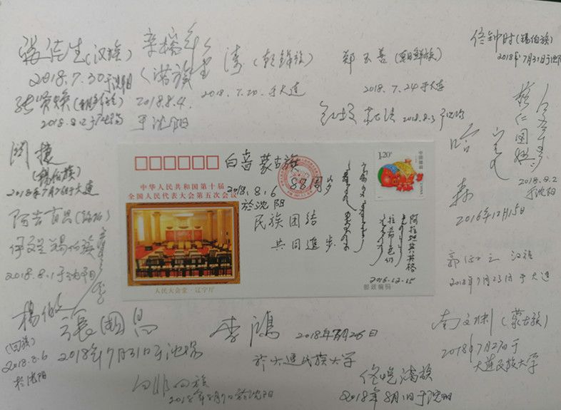 在采集口述影像錄音資料的同時,項目組還收集了大量的珍貴歷史照片以及相關文物。值得一提的是,他們設計了一種非常有特色的受訪者簽名簿,中間貼著繪有56個民族的音樂舞蹈圖案的首日封或明信片,四周簽上受訪者的人名簽名字、民族特征,有些還用民族文字書寫,體現(xiàn)了中華各民族團結在一起的精神風貌。簽名簿有厚厚的幾大本,設計精美,承載著民族工作口述史資源采集的經(jīng)歷,具有豐富的文化內(nèi)涵和博物館收藏價值。