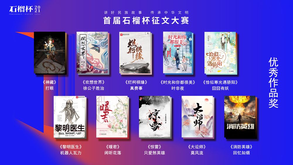 6月19日,民族題材網(wǎng)絡(luò)文學創(chuàng)作論壇暨首屆石榴杯征文大賽頒獎典禮在京舉行。作為國家民委主辦的“中華民族全家福”系列活動之一,首屆石榴杯征文大賽得到了國家民委文化宣傳司和中國少數(shù)民族文化藝術(shù)促進會的指導(dǎo)與支持,由閱文集團聯(lián)合天成嘉華文化傳媒、中國民族文化資源庫、中國民族文化資源網(wǎng)共同舉辦。本屆大賽以“講好民族故事 ,傳承中華文明”為主題,涌現(xiàn)出眾多弘揚民族精神、表達文化自信、傳播正能量的作品。經(jīng)過專家推薦及嚴格評審,《草原有座蒙古包》、《走西口之天山行》、《彩云微光》等三部作品獲“最具民族風采獎”,《神藏》、《歡想世界》、《爛柯棋緣》、《時光和你都很美》、《恰似寒光遇驕陽》、《黎明醫(yī)生》、《暖君》、《驚雷》、《大訟師》、《消防英雄》等十部作品獲“優(yōu)秀作品獎”。所有獲獎作品都將收錄入中國民族文化資源庫。中國作家協(xié)會副主席、書記處書記吉狄馬加表示,本屆石榴杯大賽是在黨和國家長期以來堅持的對民族文化、少數(shù)民族作家創(chuàng)作和民族題材創(chuàng)作的大力扶持下,依托網(wǎng)絡(luò)文學平臺,將文學作品與影視作品改編、游戲、動漫產(chǎn)品制作結(jié)合起來,探索的一條發(fā)展民族文化的新路,具有開創(chuàng)意義。