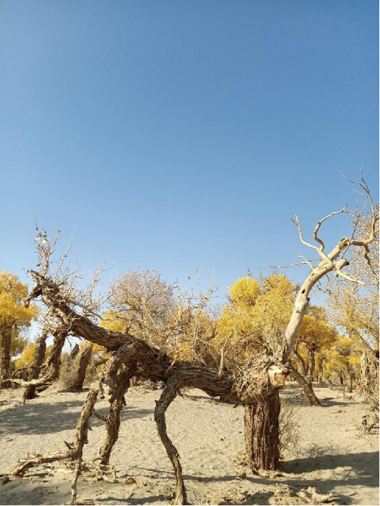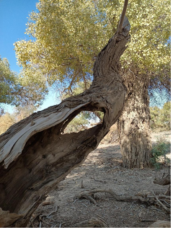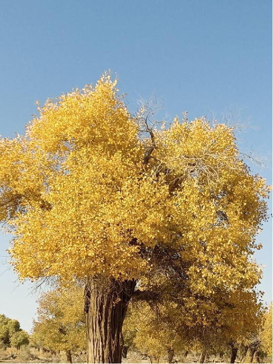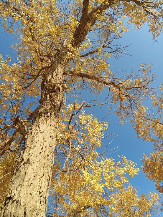 每當深秋季節(jié),胡楊樹葉變得一片金黃,形成胡楊秋色,樹影婆娑,奇妙絕倫,賞心悅目。漫步在濃郁的胡楊林中仿佛進入神話般的仙境。茂密的胡楊千奇百怪,神態(tài)萬般。粗壯的幾人難以合抱,挺拔的七、八丈之高,怪異的似蒼龍騰越,似虬蟠狂舞,令人驚奇不已,嘆為觀止。僅就密密匝匝的樹葉,也是風采獨有。幼小的胡楊,葉片狹長而細小,宛若少女嫵媚的柳眉,人們常常把它誤認為柳樹;壯齡的胡楊,葉片又變成卵形、闊卵形或三角形,猶如興安嶺的白樺;進入老年期的胡楊,葉片才定型為橢圓形。更令人稱奇者,在同一棵胡楊樹冠的上下層次,還長著不同形狀的葉片,因此,又稱“異葉楊”