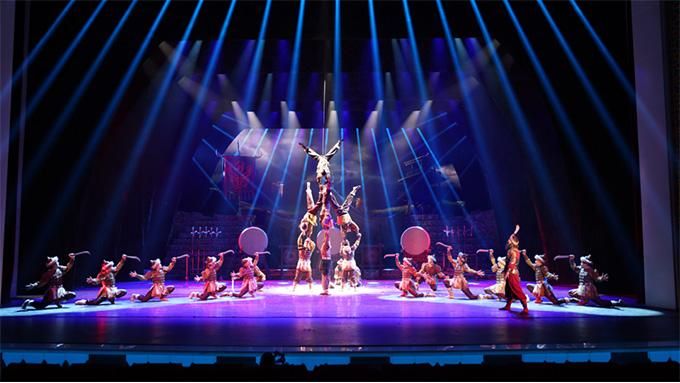 雜技是這部劇的一大亮點(diǎn)。新疆生產(chǎn)建設(shè)兵團(tuán)雜技團(tuán)近年來(lái)編創(chuàng)了《天鵝湖—男子倒立技巧》《向太陽(yáng)—繩技》《春之韻—女子造型》等多個(gè)精品節(jié)目,并在國(guó)內(nèi)外重大雜技賽場(chǎng)多次獲獎(jiǎng)。《樓蘭尋夢(mèng)》中,主創(chuàng)團(tuán)隊(duì)將這些獲獎(jiǎng)節(jié)目進(jìn)行拆解,將蹬鼓、獨(dú)輪車、吊環(huán)、肩上芭蕾、水流星及舞中幡等雜技技巧與戲劇元素相融合,讓觀眾猶如置身于黃沙漫漫的絲路古國(guó)。