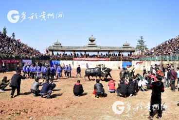 貴州省從江縣第十五屆原生態(tài)侗族大歌節(jié)的前一天,恰逢該縣逢亥斗牛日,丙妹鎮(zhèn)松學(xué)斗牛塘、谷坪鄉(xiāng)四寨河斗牛塘同時舉辦傳統(tǒng)牛王爭霸賽,喜迎一年一度“侗族大歌節(jié)”的到來,共有來自周邊村寨的80頭水牯牛參戰(zhàn),斗?;顒訄錾厦=侵穑瑘雒娈惒始姵?,吸引數(shù)萬名觀眾前來觀戰(zhàn)。