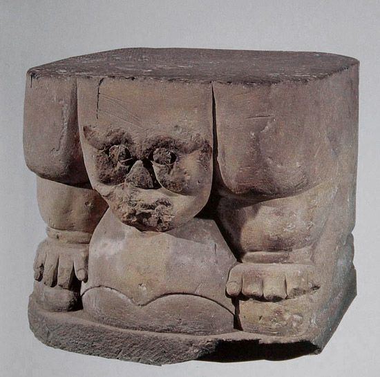 圓雕,白砂石質(zhì),近似正方體。圓雕男性人像,面部渾圓,顴骨高突,粗眉上翹,雙目圓睜且外突,鼻梁短粗,獠牙外露,下頜置于胸前,裸體,腹有肚兜,肩于頭齊,肘部后屈,雙手扶膝,下肢屈跪,背部平直。座頂左上角陰刻西夏文三行,計15個字。第一行4字漢譯為“小蟲曠負(fù)”;第二行4字漢譯為“志文支座”;第三行7字漢譯為“瞻行通雕寫流行”。背部陰刻漢文一行6字“砌壘匠高世昌”,為西夏石雕工匠的姓名,彌足珍貴。雕像以夸張的手法表現(xiàn)了負(fù)重者的神態(tài),反映出西夏時期石雕藝術(shù)的獨特風(fēng)格。迄今在西夏陵區(qū)多座帝陵的碑亭遺址中,已出土這類支座14件,但刻有西夏文字的僅此一件。