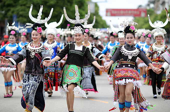 2017年4月28日,黔東南苗族侗族自治州丹寨縣盛大舉行“云上丹寨?遠(yuǎn)古霓裳”丹寨八大支系服飾巡游活動(dòng),來(lái)自全縣六個(gè)鄉(xiāng)鎮(zhèn)八大支系的2000余名苗族同胞身著節(jié)日盛裝,集聚在縣城錦雞廣場(chǎng)進(jìn)行服飾展演(黔東南苗族侗族自治州人民政府網(wǎng))