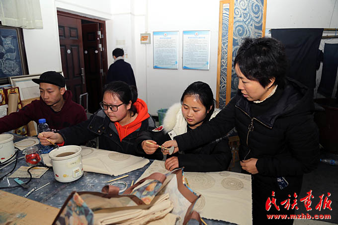 吳安麗老師(右一)在凱里學(xué)院藝術(shù)學(xué)院蠟染實(shí)訓(xùn)室指導(dǎo)學(xué)生