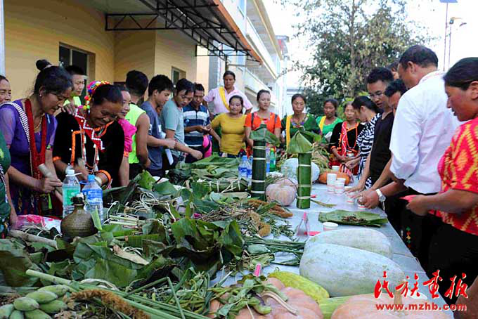 尚立文向記者介紹說:“以前景頗族過年,大年三十,一部分男人在家殺年豬,其余的就上山打獵。景頗族很慷慨,凡是獲取到的獵物,見者都有份。女人除了在家準備年夜飯,也會上山或下壩子采野菜等。但不管是打獵的還是摘野菜的,都必須在太陽落山前到家,闔家歡度春節(jié)吃年夜飯?,F(xiàn)在生活好了,不打獵不摘野菜了,但還是得遵循太陽落山之前到家的習(xí)俗。”