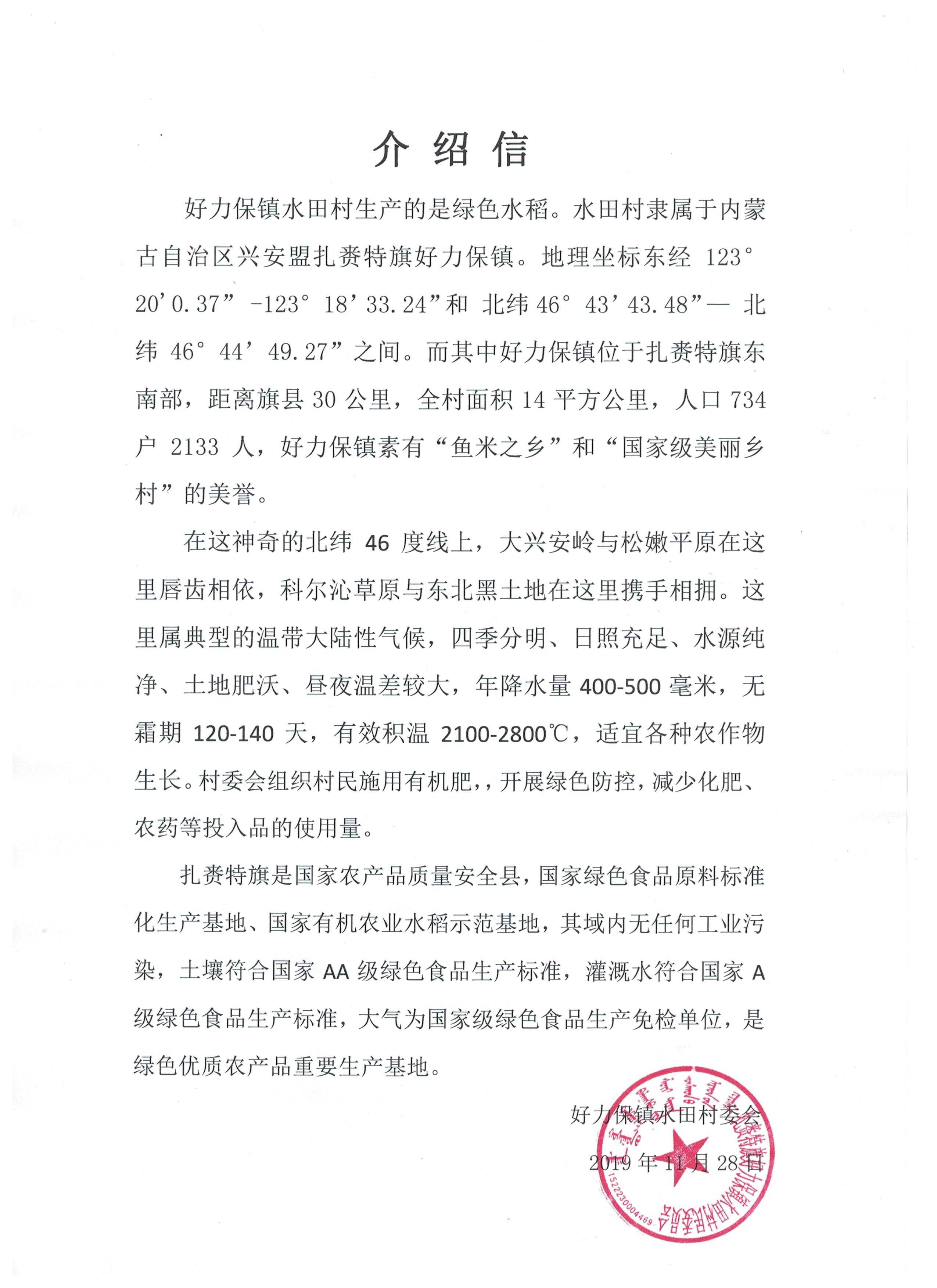 蒙古屯村屬好力保鎮(zhèn),沿綽爾河岸而建,水田較多,祖輩種植水稻。蒙古屯村的土壤以黑土為主、土質(zhì)肥沃,全年積溫在2600到2700攝氏度左右、并且早晚溫差較大,有利于水稻中有機(jī)物的積累。綽爾河水充足時(shí),可以滿足沿岸灌溉需求;河水流量較少時(shí),蒙古屯村自有的機(jī)井也可以滿足種植所需的水量。
